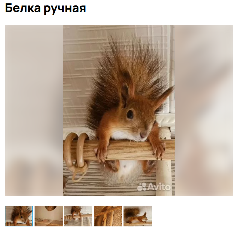 Любителям экзотики предлагают ручную годовалую белку за 10 000 рублей. В комплекте идёт просторная клетка и беговое колесо.