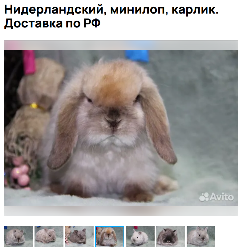 Миниатюрный кролик породы нидерландский минилоп, весом всего 1,5 кг, выглядит весьма недовольным. Питомник карликовых кроликов просит за него 2500 рублей и предлагает доставку в любой регион.