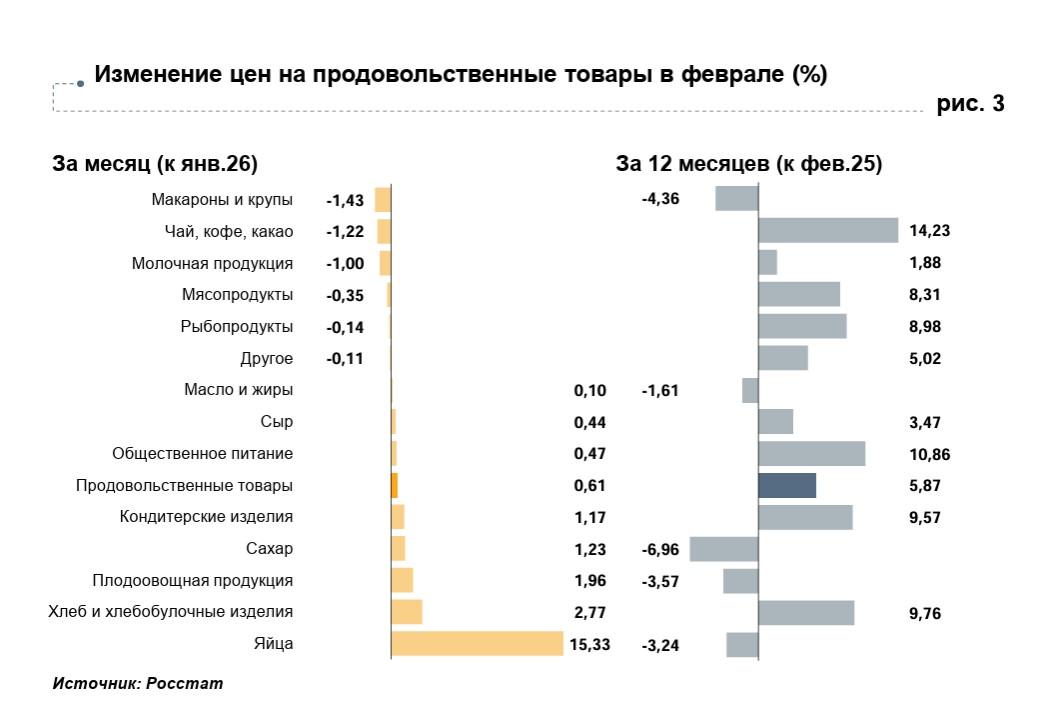 Среди продуктов питания наиболее значительно подорожали куриные яйца. «В регионе больше, чем по России в целом, подорожали яйца. Это объясняется коррекцией цен: ранее с декабря по январь они в области дешевели, а в среднем по России — дорожали. В феврале производители компенсировали этот разрыв более значительным повышением цен», — отмечается в сообщении.