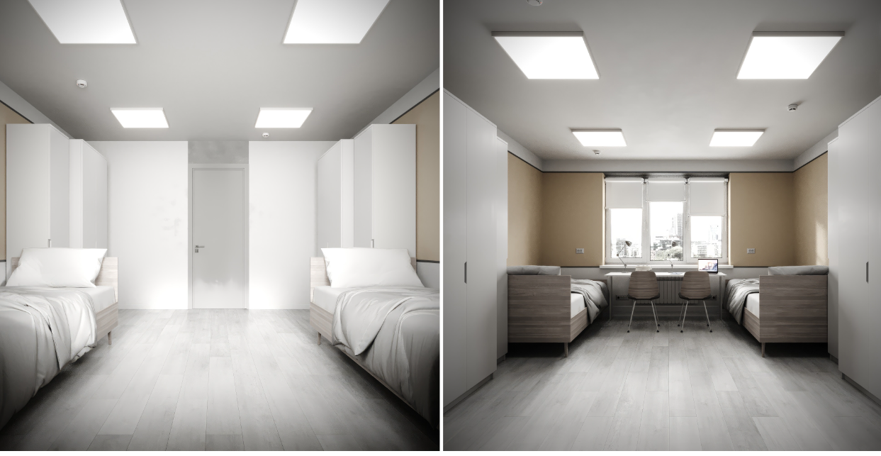 Согласно конкурсной документации, после ремонта комнаты будут напоминать гостиничные номера. Интерьеры выполнят в светлых тонах, полы покроют плиткой, установят современные кровати, столы и системы освещения. Особое внимание уделят разуплотнению: в каждой комнате будут проживать не более трех студентов.