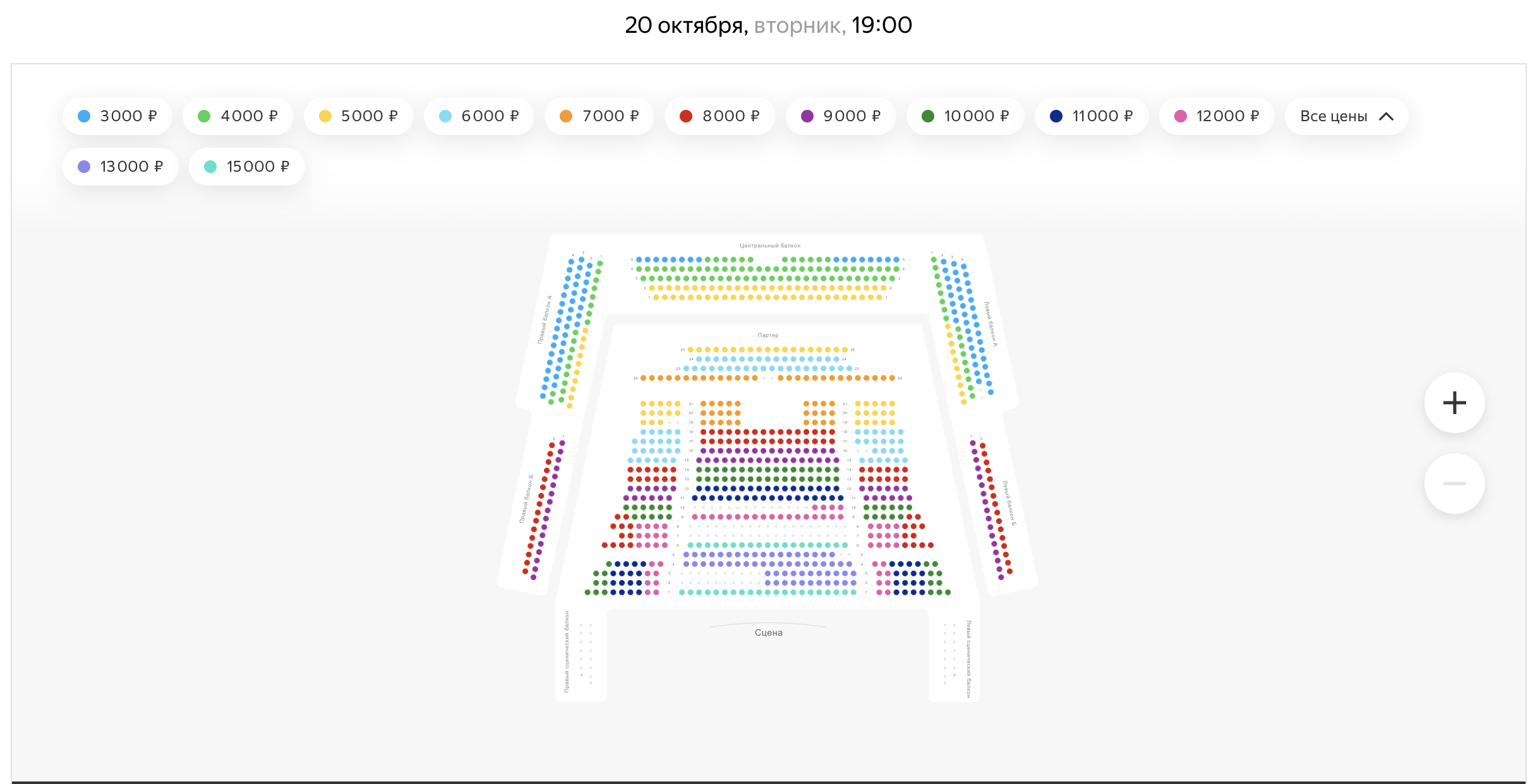 - Партер рядом со сценой: от 10 000 до 15 000 рублей.