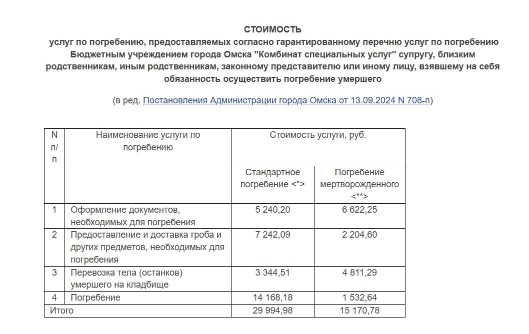 По информации 2014 года, полная цена самых простых похорон в Омске составляла около 30 000 рублей. Базовый набор услуг включал в себя: