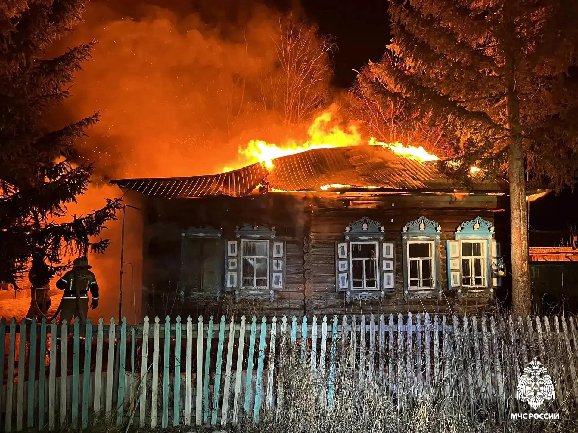 К сообщению о происшествии прикреплены фотографии и видеозапись с места событий. На опубликованных кадрах видно сильное пламя, охватившее деревянное строение изнутри.