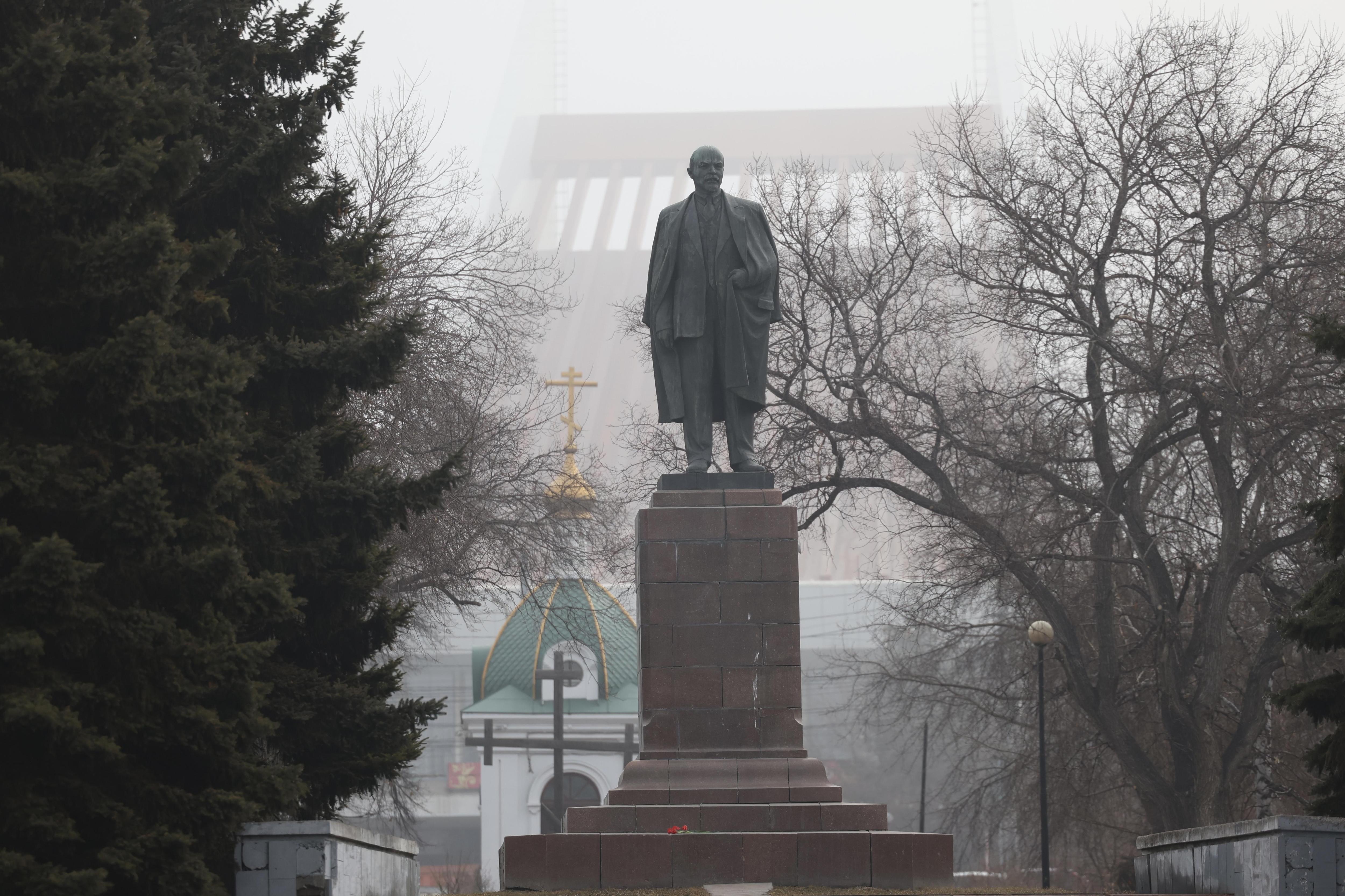 Памятник Ленину, скрытый густой туманной пеленой