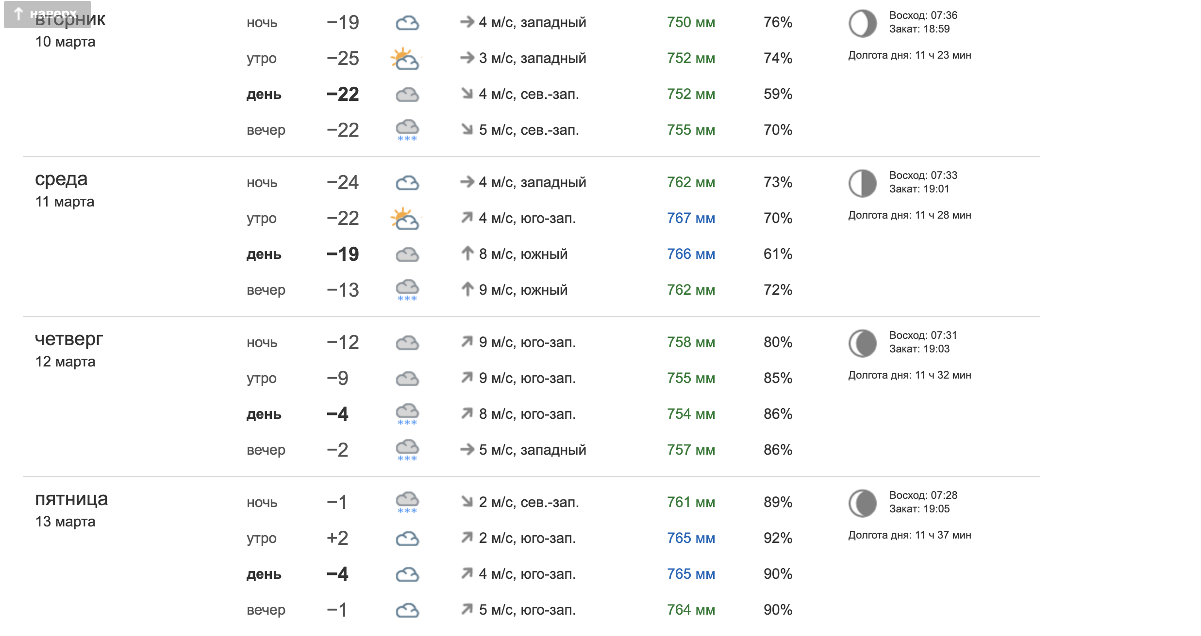 В четверг, 12 марта, снег будет идти днем и вечером. Температурный диапазон составит от -9 до -2 градусов, ветер не ослабнет. В пятницу, 13 марта, наметится потепление: утром до +2 градусов, однако днем столбик термометра вновь опустится до -4. Небо будет покрыто облаками.