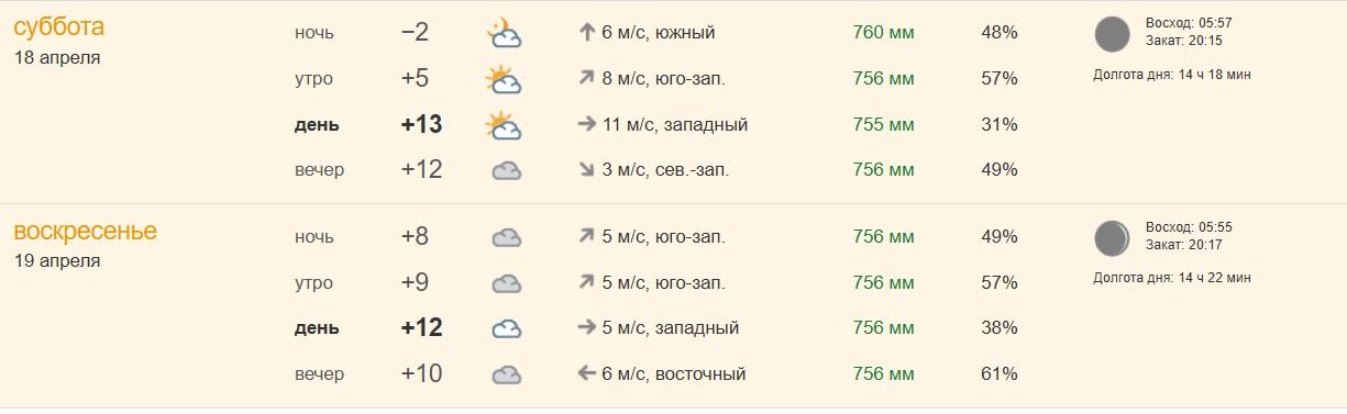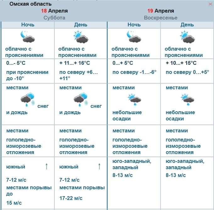 В воскресенье, 19 апреля, утро начнется с +9 градусов по версии «Погоды NGS55.RU», а днем будет около +12 градусов. Солнце скроется за облаками. Обь-Иртышское УГМС обещает ночью 0…+5 градусов, днем +10…+15 градусов, а также ветер и небольшие осадки.