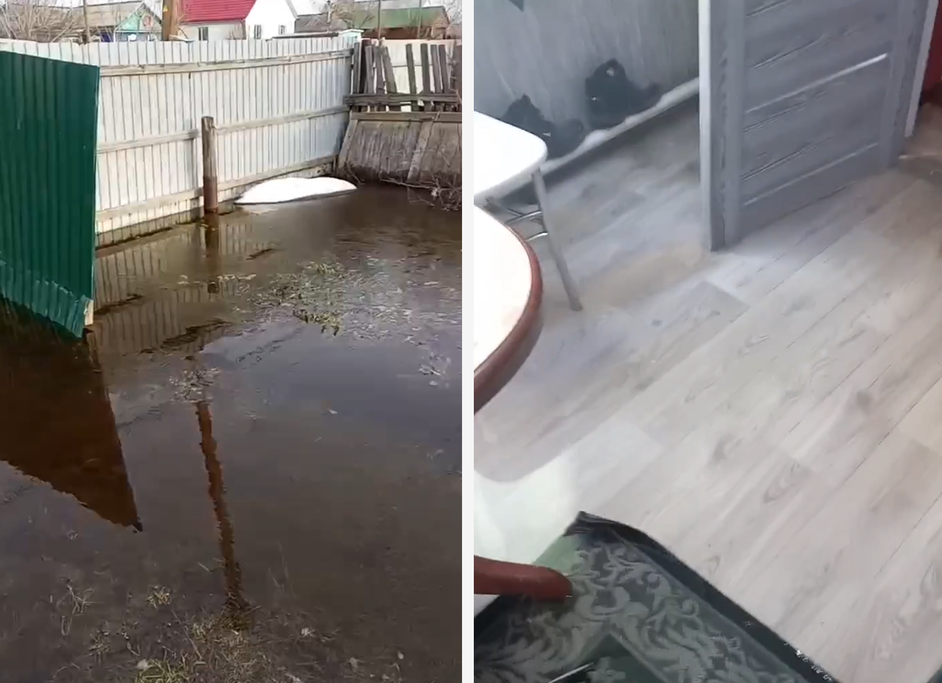 Его хозяин рассказывает: «Кухня, двери — все в воде. Обшито панелями МДФ. Тоже им капец. Цементная стяжка провалилась, линолеум порвало. В зале пол ниже, воды сантиметров 10, выше щиколоток».
