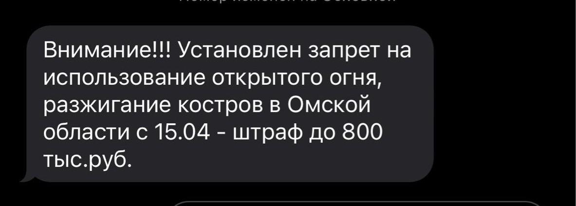 «Внимание! Установлен запрет на использование открытого огня, разжигание костров в Омской области с 15.04 — штраф до 800 тысяч рублей», — говорится в одном из таких сообщений.