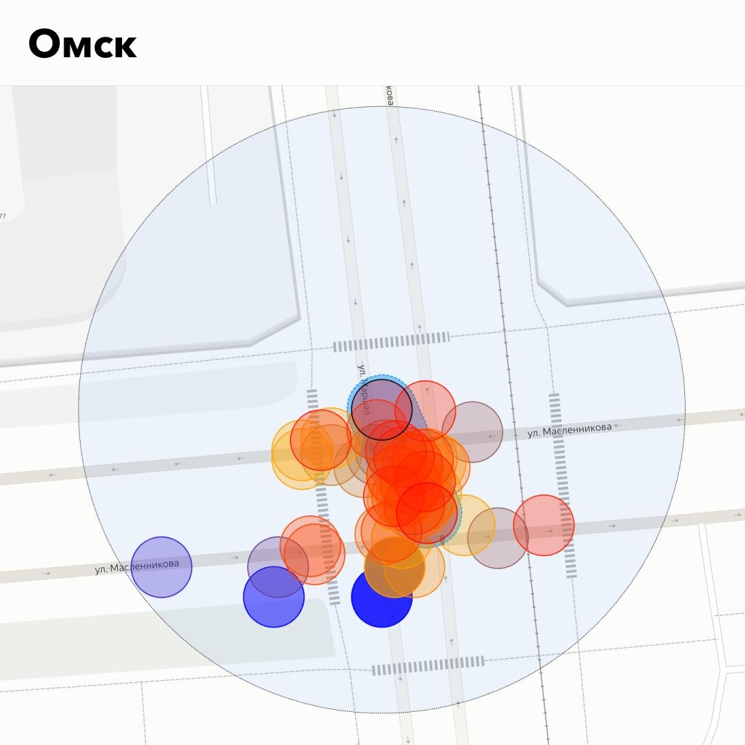 Согласно информации от компании «СпецДорПроект», перекресток улиц Маршала Жукова и Масленникова в Омске занимает первое место по аварийности в России. За период с 2015 года там произошло 67 дорожно-транспортных происшествий. Уровень повторяемости инцидентов классифицирован как экстремальный, а в промежутке с 2022 по 2026 годы среднегодовой показатель составил 5,2 аварии.