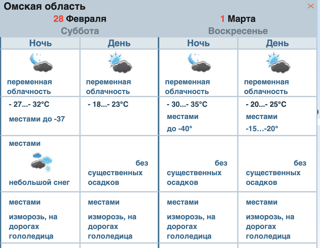 По данным Обь-Иртышского управления по гидрометеорологии, в области морозы будут ещё сильнее. В ночь на субботу воздух может остыть до -37 градусов, а в ночь на воскресенье — местами до -40. Днём температура сохранится в диапазоне от -18 до -25 градусов.