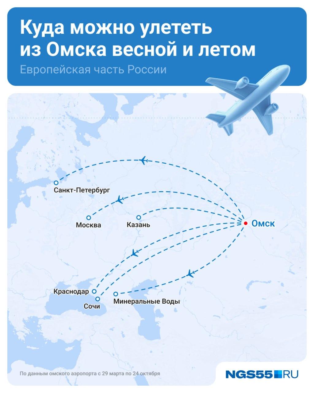 В европейской части России из Омска можно будет улететь в Санкт-Петербург, Москву, Казань, Сочи, Минеральные Воды и Уфу. Новинкой сезона станет направление в Краснодар от авиакомпании Nordstar, первый рейс запланирован на 21 мая.