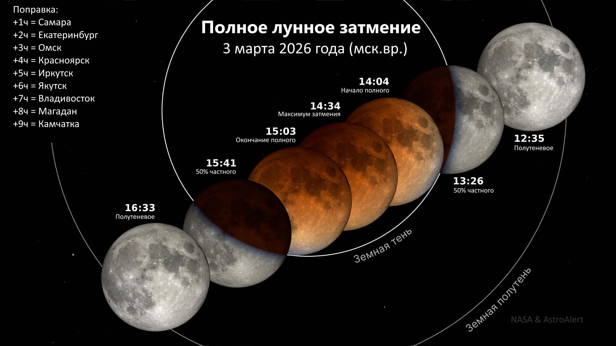 Единственное в 2026 году полное лунное затмение произойдет 3 марта, и жители Омска смогут его наблюдать.